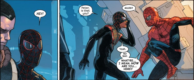 After the world was restored to the former Earth-616, Miles and Peter were placed on a rooftop together with Miles finding out his mother is alive in this new world, a wish granted by Molecule Man.