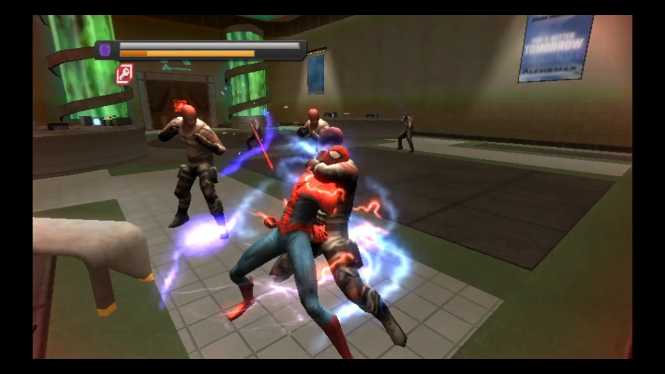Then, with instructions from Miguel, Peter tries luring the Atrocity back to the time lab; a run through the fixed portal will negate the time storm and separate Atrocity back into Doctor Octavius, Sloan, and Anti-Venom. During the run, Parker is forced to steal a guard's pass to get through a door, which leads to him teleporting.