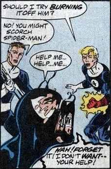 Once back on Earth, Spider-Man learned the costume was a sentient alien symbiote that wished to fuse permanently with him and often controlled his body while he slept. With the aid of Mr. Fantastic and the Human Torch, Spider-Man discovered the symbiote was vulnerable to sound and flame, and he used sonic waves to remove it and flames to scare it into a containment module.